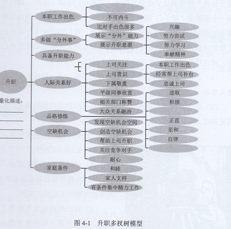 另外,還有諸如保持耐心等許多其他必要條件、充分條件以及輔助條件。下面的升職多權(quán)樹可以為我們制定一個(gè)更系統(tǒng)的升職計(jì)劃提供進(jìn)步參考(見圖4-1)。